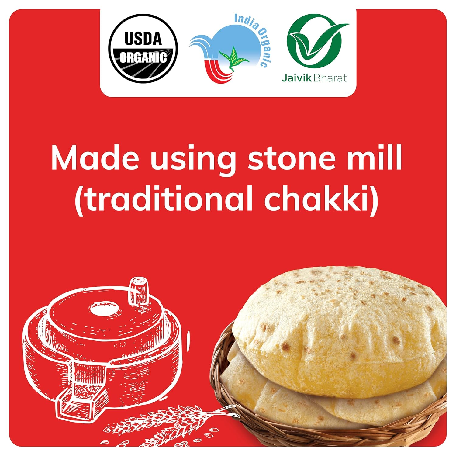 This premium atta is 100% organic, grown without harmful chemicals or pesticides, making it a healthier choice for your everyday meals. Its fine texture and natural aroma ensure soft, fluffy rotis and chapatis every time.