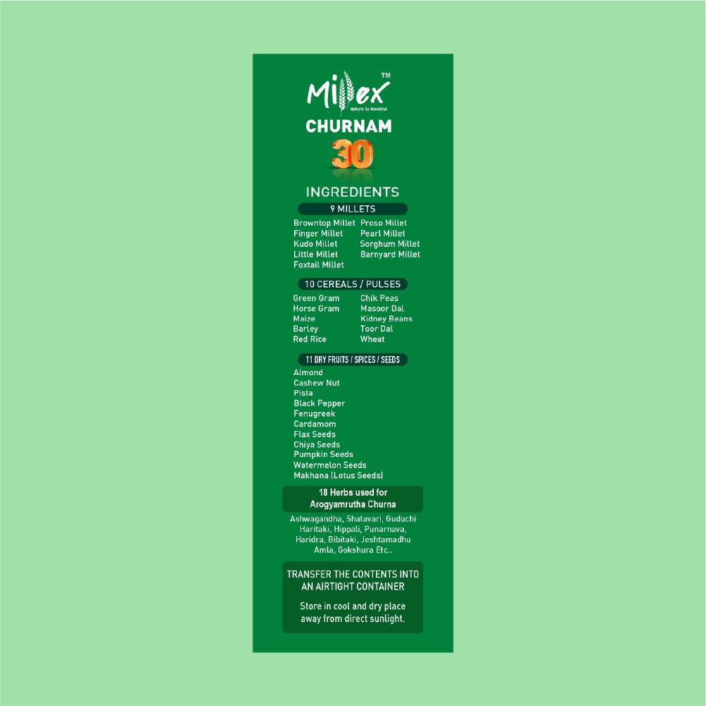 Millex Millet Healthy Mix is a premium, nutrient-dense blend crafted from 30 natural ingredients and enriched with 18 powerful herbal churnas. Made using sprouted cereals, pulses, and nuts, this wholesome mix is designed to support overall health, digestion, and daily energy — without any added sugar.